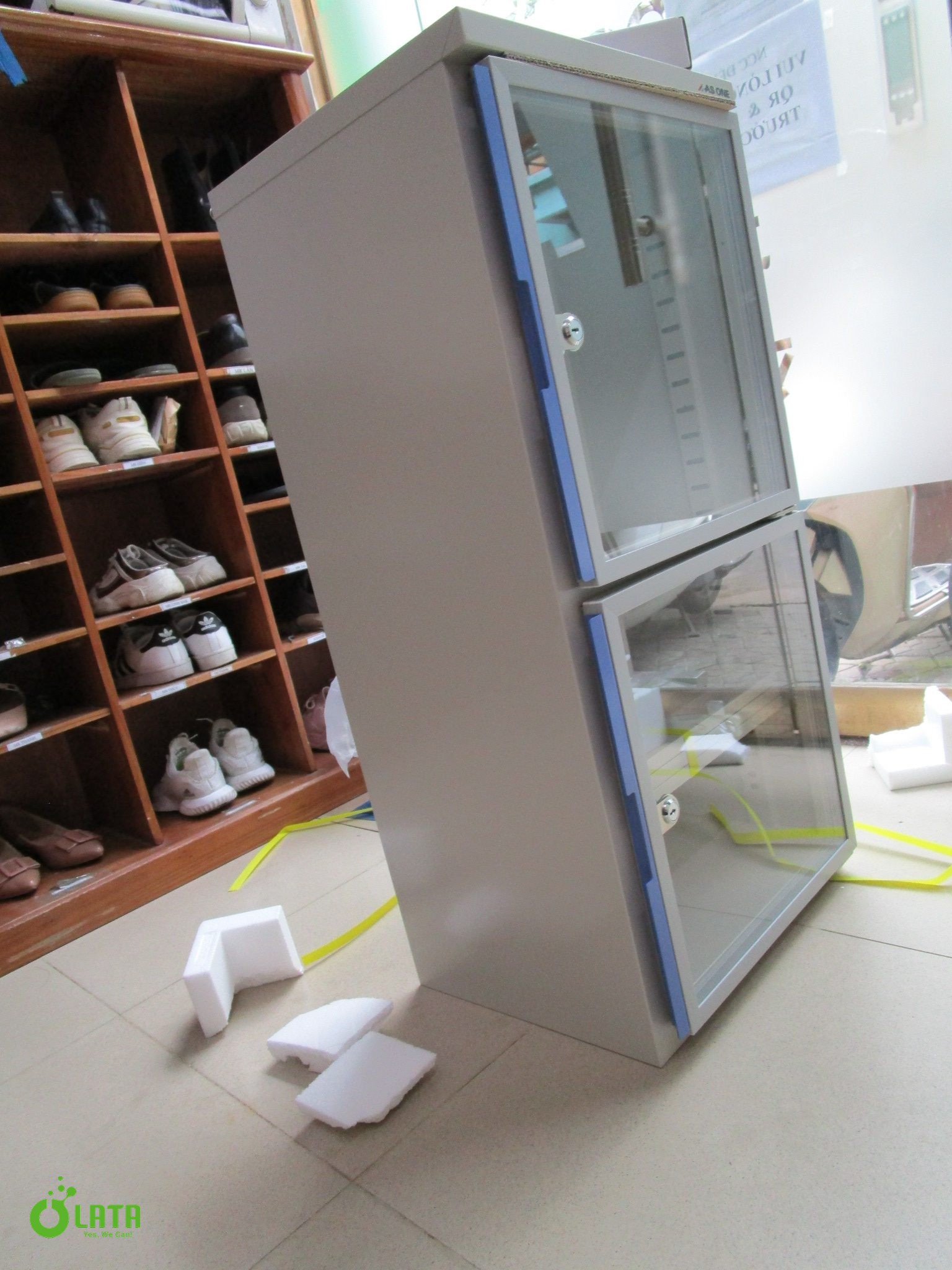 Chất liệu: Thân chính / Thép tấm (hoàn thiện nướng melamine), Mặt trước / Kính